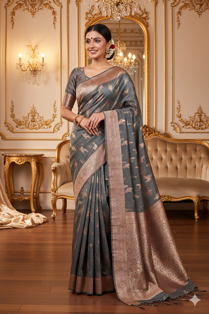 Linen Silk: A luxurious blend of breathable linen and lustrous silk, giving this saree a soft yet structured drape.