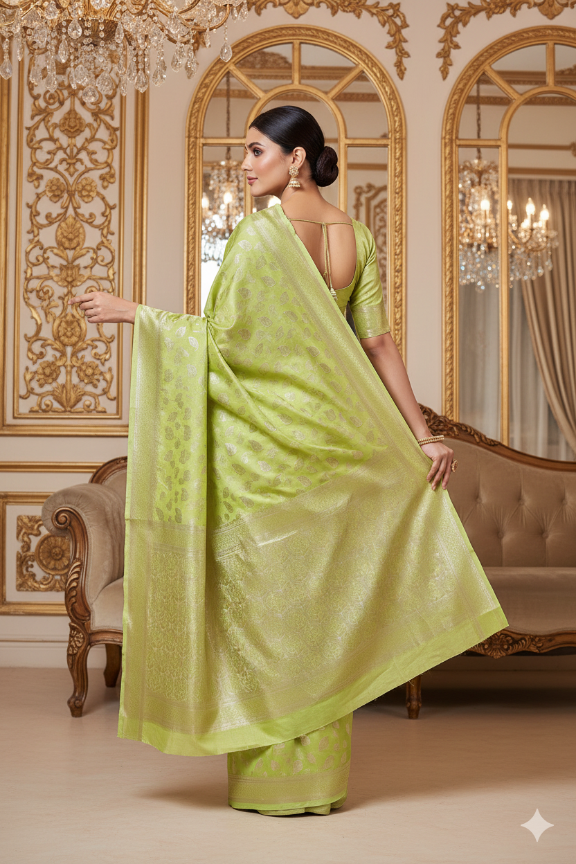 💎 Blouse: Comes with a matching parrot green silk blouse piece with zari detailing on the border (unstitchable).