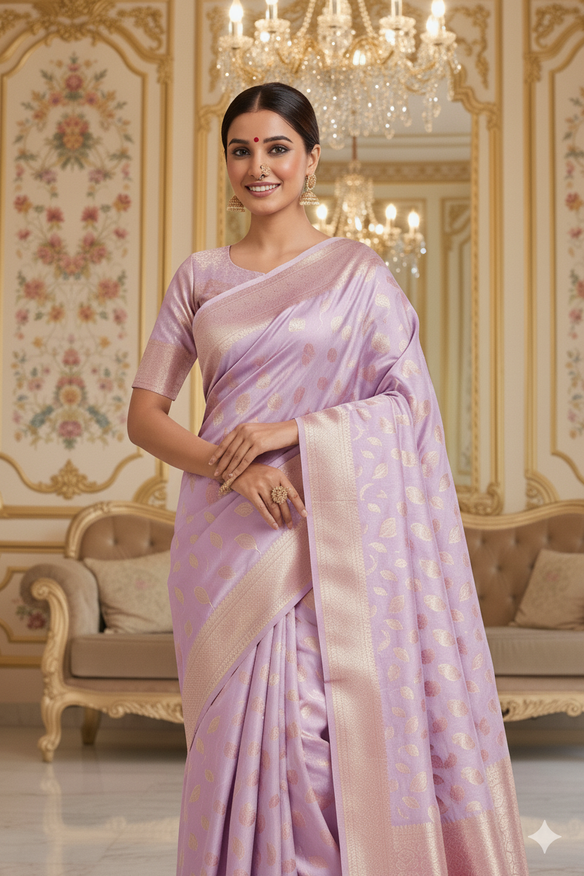 Work: All-over woven golden zari work with intricate leaf motifs, lending a delicate yet festive charm