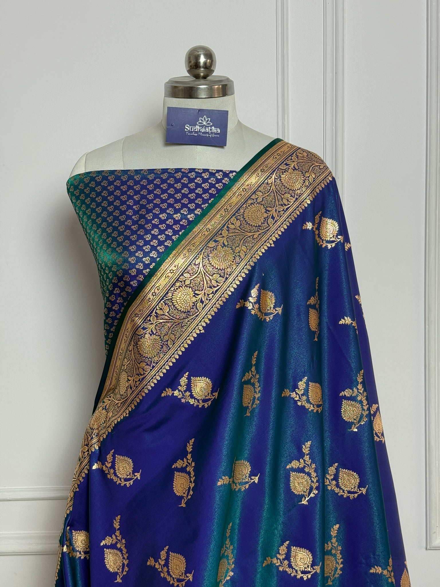 This saree features a majestic royal blue hue that exudes timeless elegance. The body is adorned with gold zari buta motifs, meticulously handwoven in pure Katan silk threads that lend a natural sheen and luxurious drape.