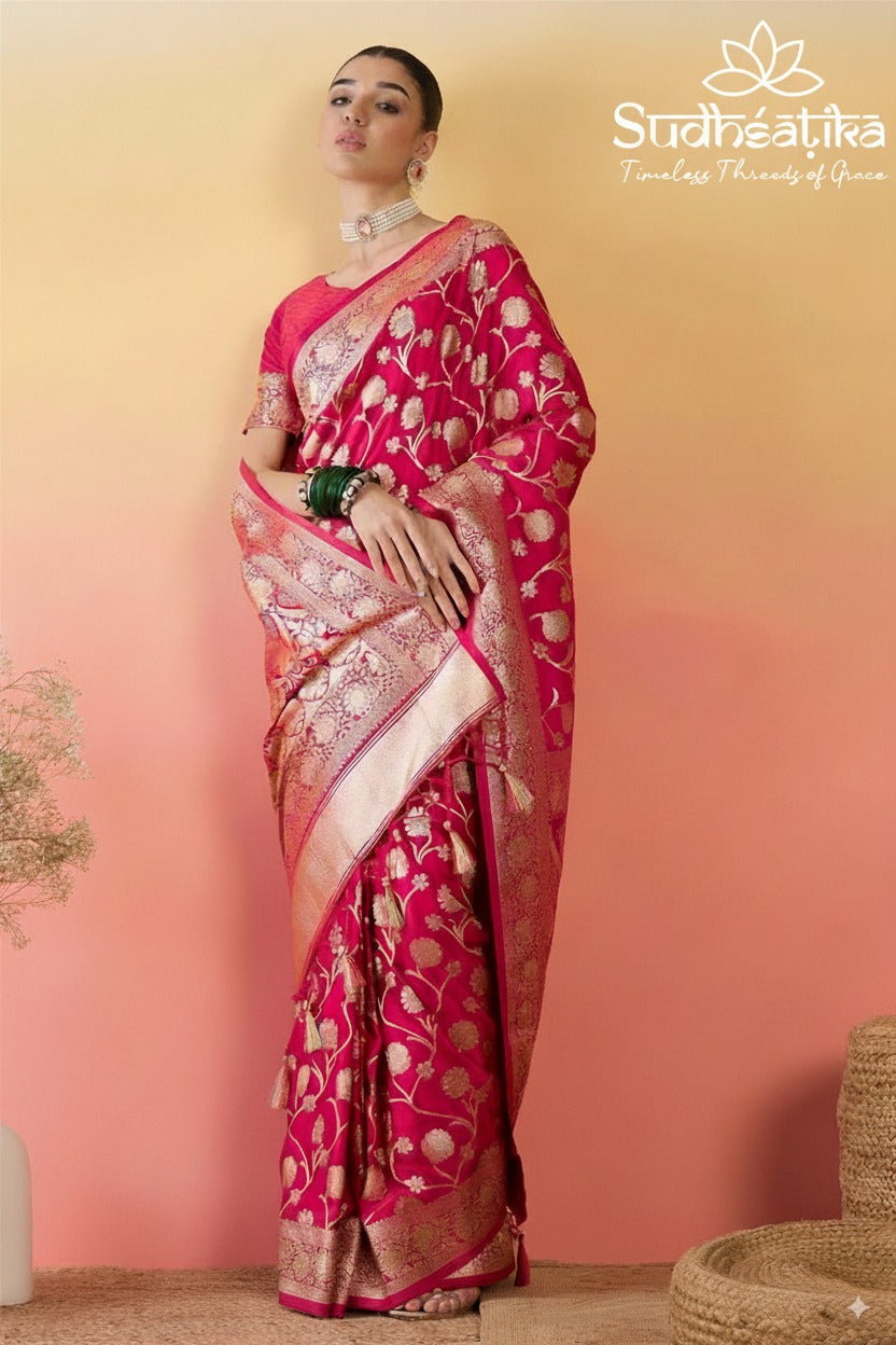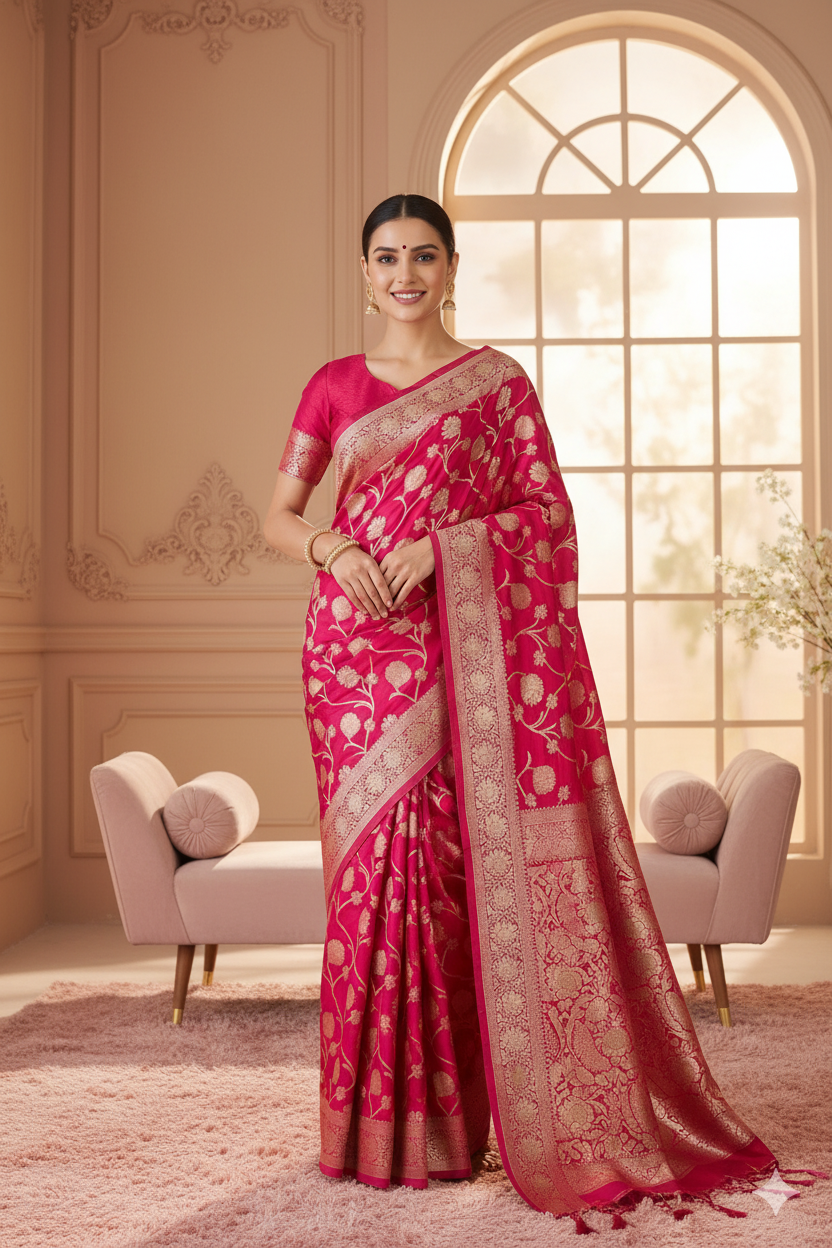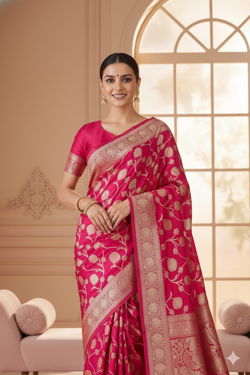 Blouse: Comes with a matching Rani Pink blouse piece with zari detailing on the sleeves (as shown in the image).