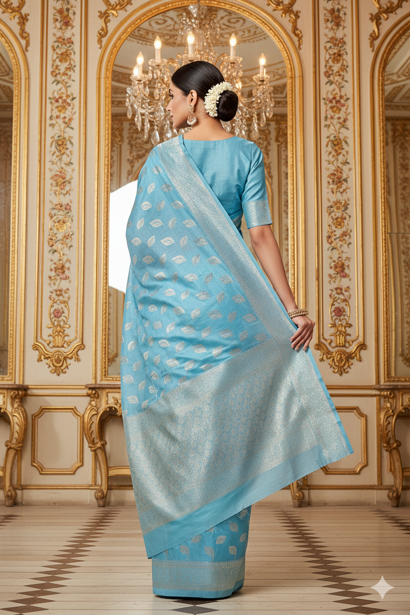 All-over silver zari woven motifs in a leaf pattern, giving the saree a nature-inspired, timeless elegance.