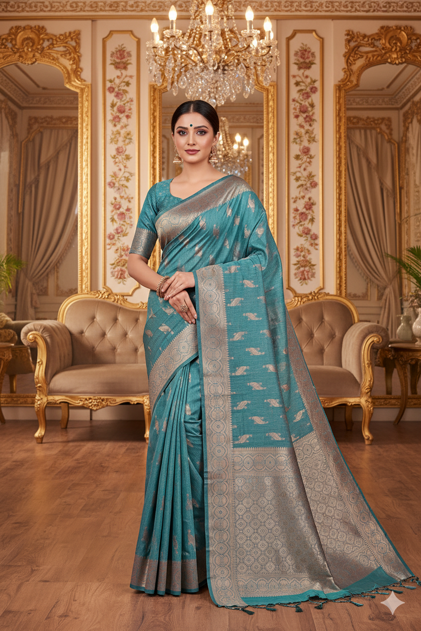 Linen Silk: A luxurious blend of breathable linen and lustrous silk, giving this saree a soft yet structured drape.